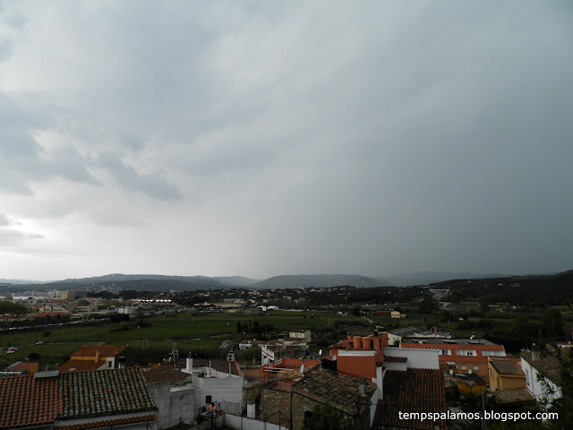 Cortines precipitació al fons de la imatge, cap a Romanyà de la Selva, a Calonge i al sector del Puig d'Arques, poc després de les sis de la tarda del passat dissabte 15 d'abril.