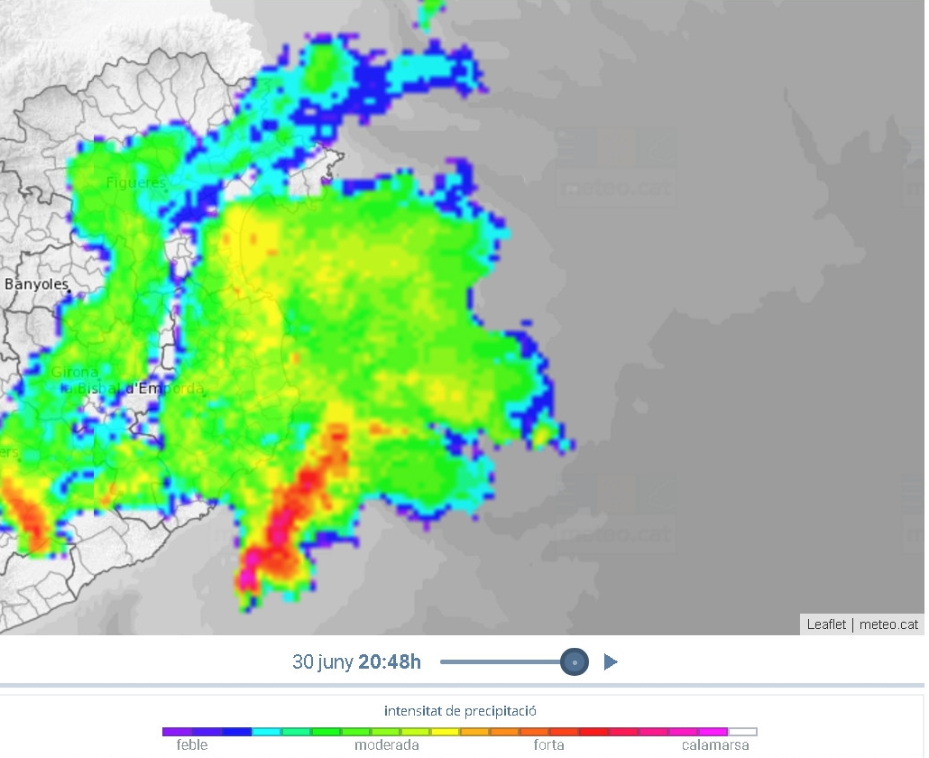 Imatge composada dels radars meteorològics del passat divendres 30 de juny a les 15:42h. Veiem una tempesta intensa al nord del Baix Empordà.