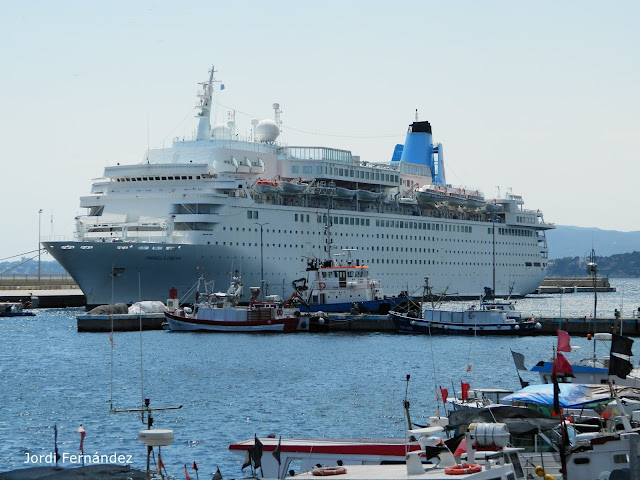 Temps assolellat, onatge aixecat pel garbí i el creuer Marella Dream atracat al port de Palamós, el passat dilluns 15 de juliol a la tarda.