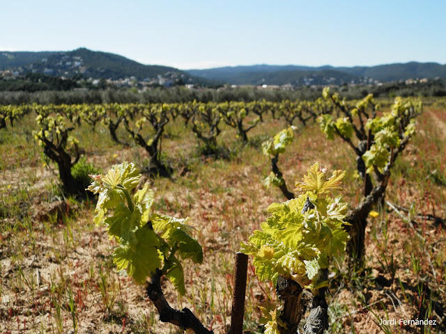 Temps assolellat, amb cel ras, i una vinya amb brots tendres a Calonge a primeres hores de la tarda.