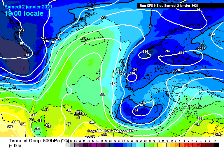 Mapa de geopotencial a 500 hPa i de pressió en superfície del passat dissabte 2 de gener a les 19:00h. Veiem una clara advecció d'aire àrtic establerta entre l'anticicló de les Açores i la pertorbació del golf de Gènova.